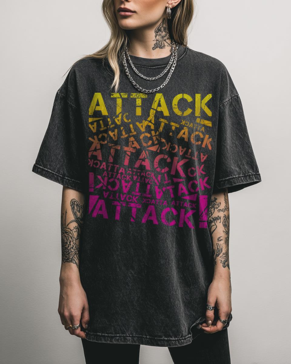 Looking for a bold and energetic graphic tee that makes a statement? Unleash a burst of energy with this vibrant ‘Attack!Attack!Attack!’ graphic t-shirt! This design features a dynamic, colorful text pattern that conveys a sense of urgency and excitement. It’s a striking piece for anyone who loves abstract art, bold statements, and playful typography. A…