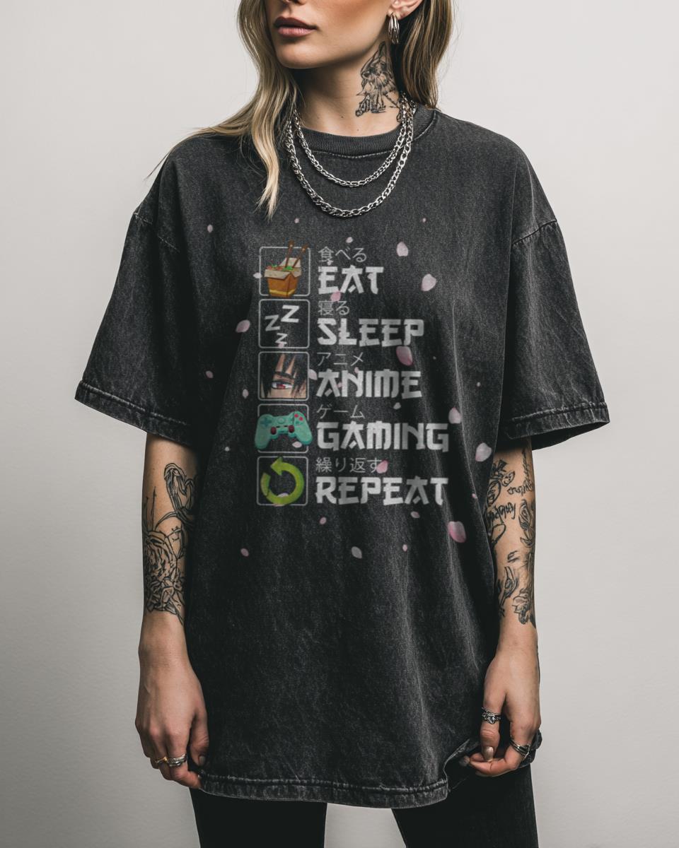 Does your daily routine revolve around anime and video games? Proudly display your passions with this hilarious ‘Eat Sleep Anime Gaming Repeat’ tee! This design perfectly captures the life of a dedicated gamer and anime enthusiast, blending Japanese kawaii style with a relatable, funny mantra. It’s the ultimate outfit for conventions, gaming sessions, or just…
