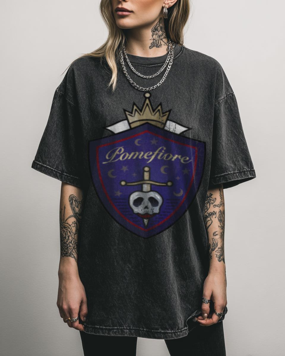 Show your loyalty to the elegant Pomefiore House! Dive into the magical world of Night Raven College with our ‘Pomefiore’ T-shirt, featuring the distinctive logo from Disney’s Twisted Wonderland. This design is perfect for fans of the popular anime-style video game, allowing you to proudly represent the beautiful and rigorous students of the Pomefiore dorm….