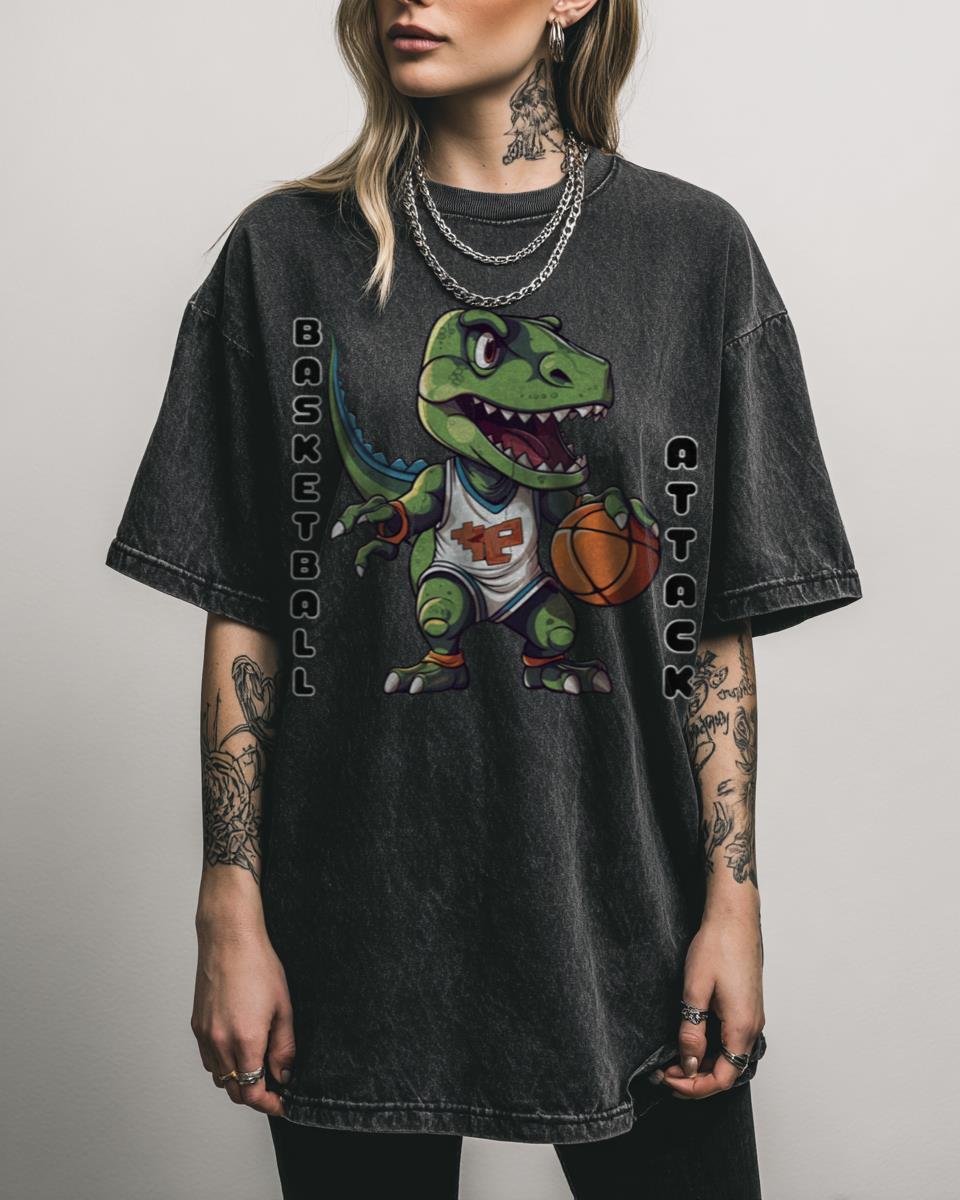 Looking for a unique blend of sports and prehistoric fun? Unleash your playful side with this ‘Basketball Dinosaur Attack’ design! Featuring a fun, kawaii-style green dinosaur comically attempting to play basketball, this graphic brings an abstract, energetic vibe perfect for sports fans and dinosaur lovers alike. It’s a humorous take on the game, guaranteed to…