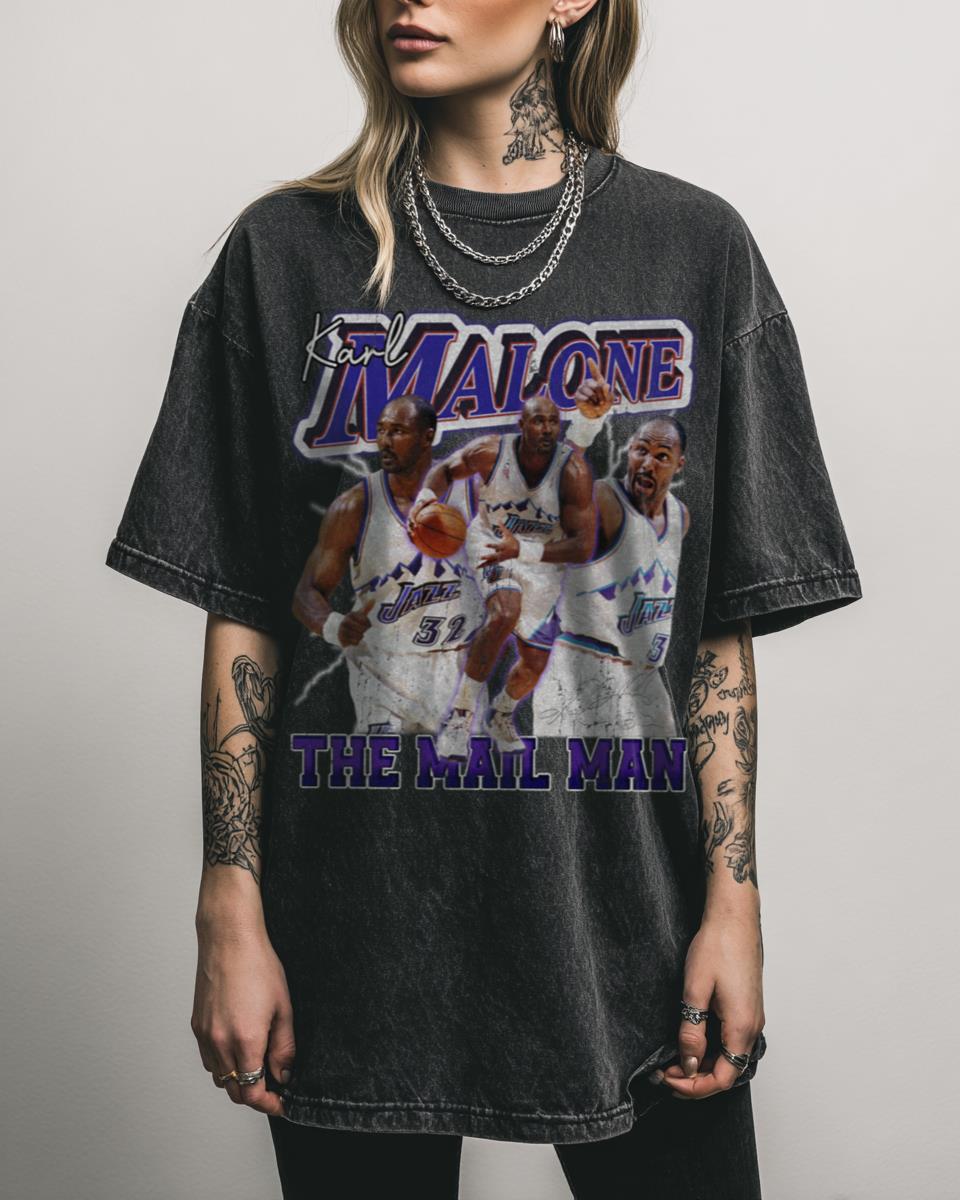 Deliver some serious style with this vintage tribute to NBA legend Karl ‘The Mailman’ Malone! This ‘Vintage Karl Malone’ design features the iconic ‘Mailman’ in classic 80s-90s bootleg rap tee style, celebrating his powerful presence on the court. It’s a must-have for fans of retro NBA, hip-hop culture, and the Utah Jazz. Why You’ll Love…