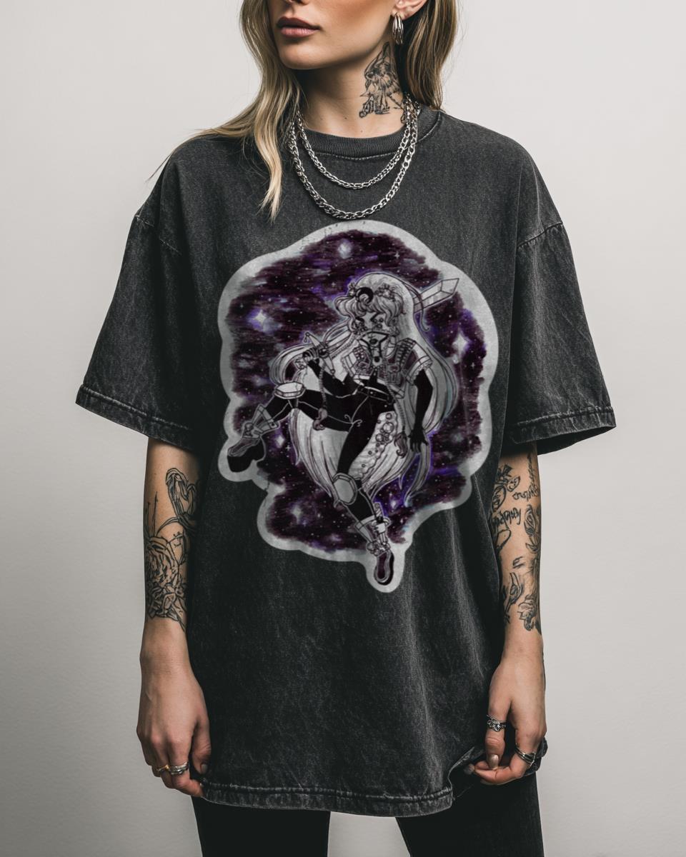 Conquer the cosmos in monochromatic style! Unleash your inner cosmic hero with this striking Moon Warrior Black & White T-shirt. Featuring a powerful warrior woman wielding a sword against a backdrop of a nebula-filled galaxy, this design captures the essence of magical girl aesthetics with classic 90s sci-fi, now in a timeless grayscale. Perfect for…