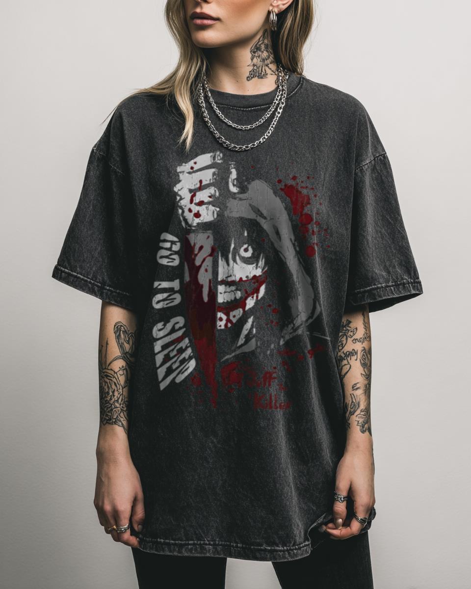 Dare to wear the chilling legend of Creepypasta? This terrifying t-shirt features the iconic phrase “Go To Sleep” associated with the infamous Jeff The Killer. Perfect for fans of horror stories, creepypasta legends like Slenderman, Eyeless Jack, and Laughing Jack, and those who appreciate the darker side of anime-inspired lore. Why You’ll Love This Creepypasta…