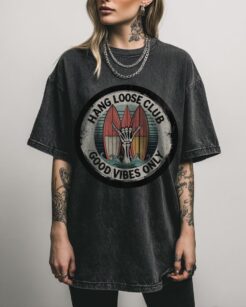 What Makes This Skeleton Surf Tee So Cool? Catch a wave of good vibes with this ‘Hang Loose Club’ skeleton t-shirt. This awesome tee features a skeleton hand throwing a shaka sign, embodying the chill, ‘Good Vibes Only’ surf lifestyle. With its retro, grunge surf aesthetic, it’s the perfect shirt for any wave rider or…