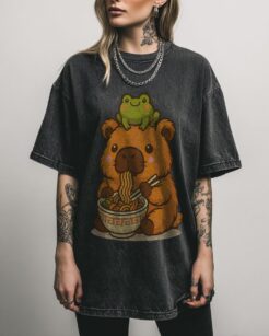 What Makes This Capybara and Frog Tee So Adorable? Level up your cuteness factor with this kawaii capybara and frog t-shirt. This incredibly charming design features a capybara and frog friendship duo, complete with a ramen-themed backpack. It’s the perfect piece of pastel, anime-style apparel for toddlers, kids, and anyone who loves cute animal graphics….
