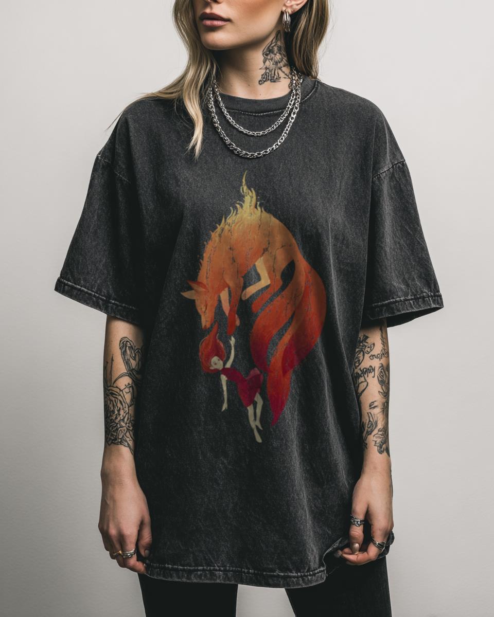 Discover the Enchantment of Our Kitsune Fire Fox Fantasy T-Shirt! Embrace the mystical with this **Kitsune Fire Fox acidwash t-shirt**, a captivating fan-created design featuring a charming fantasy fox. Inspired by Japanese folklore and anime aesthetics, this graphic tee brings a touch of magical woodland wonder to your wardrobe. The unique black acidwash finish adds…