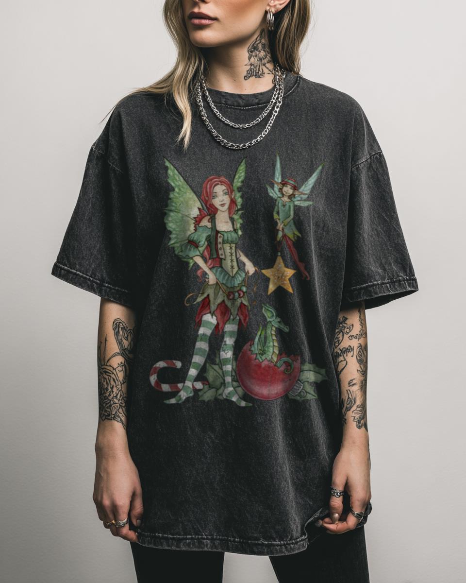 Step into a magical winter wonderland with a touch of fantasy? Adorn your holiday season with the enchanting “Tree Trimmers” design by acclaimed artist Amy Brown. This whimsical fantasy art piece features charming fairies, playful pixies, and perhaps a friendly dragon, all engaged in the festive task of trimming a Christmas tree with candy canes…