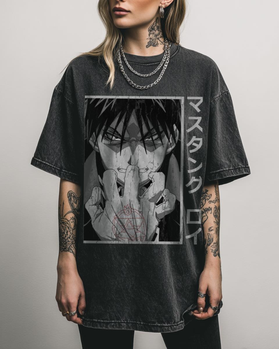 Searching for an Impressive Colonel Roy Mustang T-Shirt? Showcase your admiration for the State Military with this striking Colonel Roy Mustang Fullmetal Alchemist Graphic T-Shirt. Featuring the Flame Alchemist on unique black acidwash fabric, it’s a powerful statement piece for FMA fans. Why This FMA Brotherhood Tee is a Stellar Choice: Iconic Colonel Mustang Artwork:…