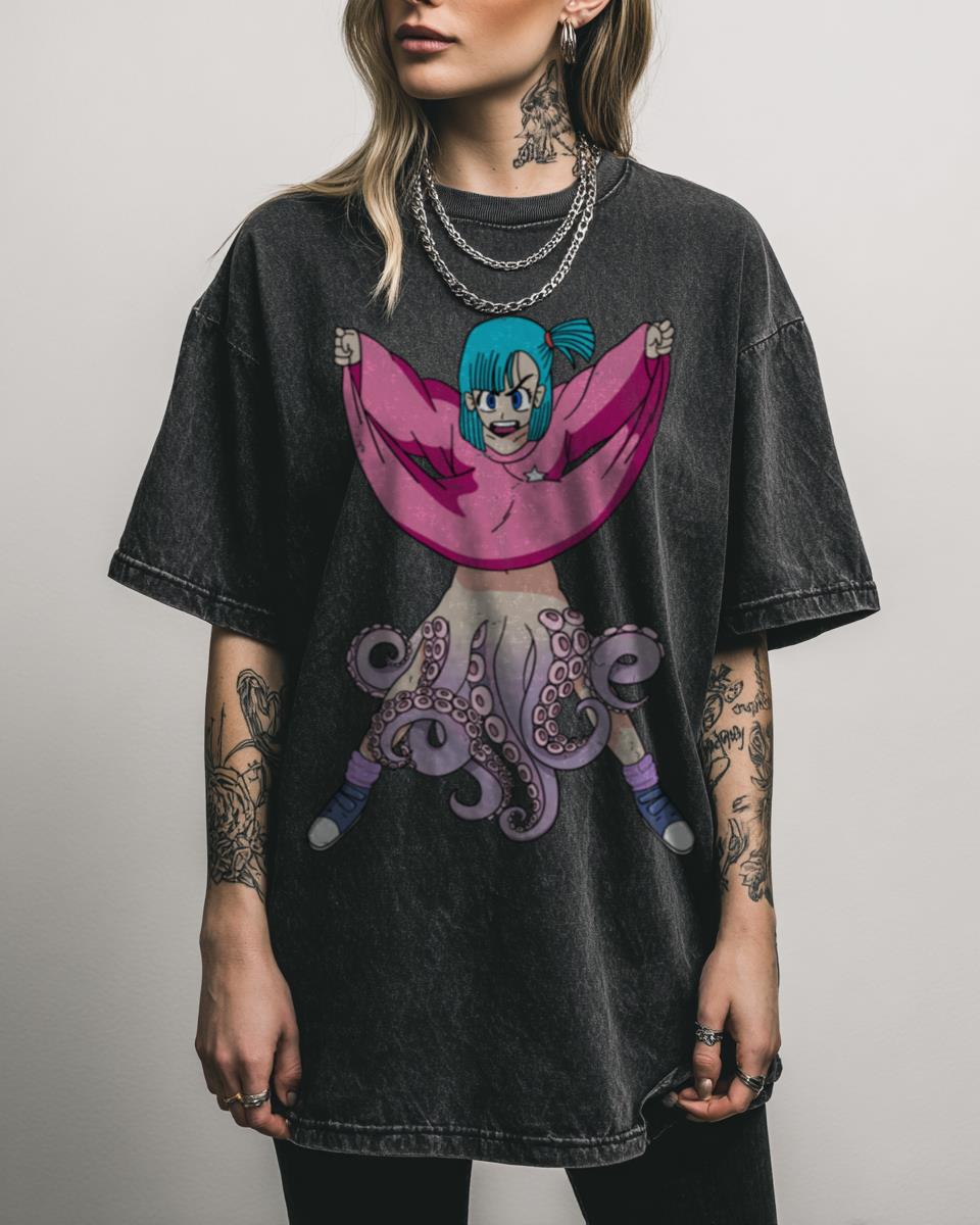Ever wondered what Bulma would look like as a magnificent cephalopod? Dive into the quirky side of Dragon Ball Z with this “Bulmapus!” design. This humorous graphic creatively combines the iconic Bulma with an octopus, making for a unique and eye-catching piece that’s perfect for DBZ fans who love a good laugh and imaginative art….