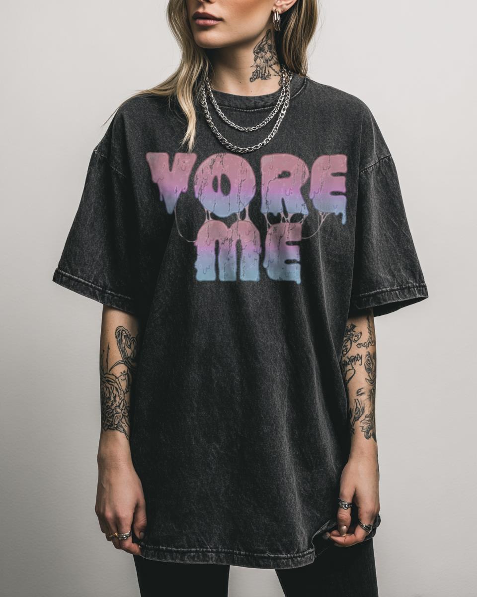 Looking for a bold and unique statement piece within the furry fandom, with a softer touch? This “VORE ME – Pastel” design offers a distinct aesthetic for those familiar with and part of the furry community. It’s a niche, graphic tee that speaks directly to specific interests within the fandom, presented with a striking pastel…