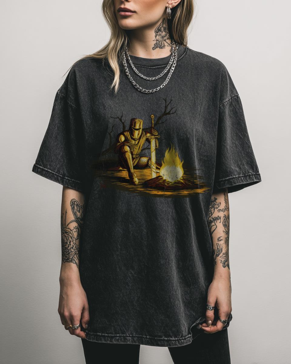 Seeking comfort in the dark world of fantasy? Gather ‘At The Bonfire’ with this unique T-shirt, inspired by the iconic Dark Souls series. This cartoon-style design features a lone knight by the bonfire, a symbol of respite in a challenging fantasy realm. Perfect for gamers and fans of dark fantasy art. Why You’ll Love This…