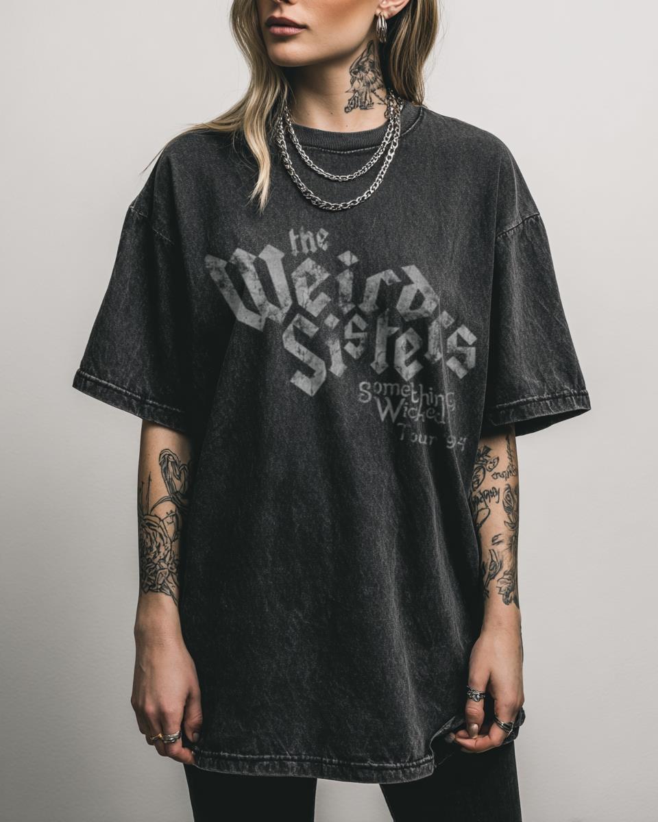 Ready to Rock the Wizarding World with the Weird Sisters? Embrace your inner wizard rock fan with this unique Weird Sisters Something Wicked Tour graphic tee, inspired by the iconic band from the Wizarding World. Featuring a cool, distressed design on a black acidwash 100% cotton shirt, it’s the perfect fan-created apparel for any Harry…
