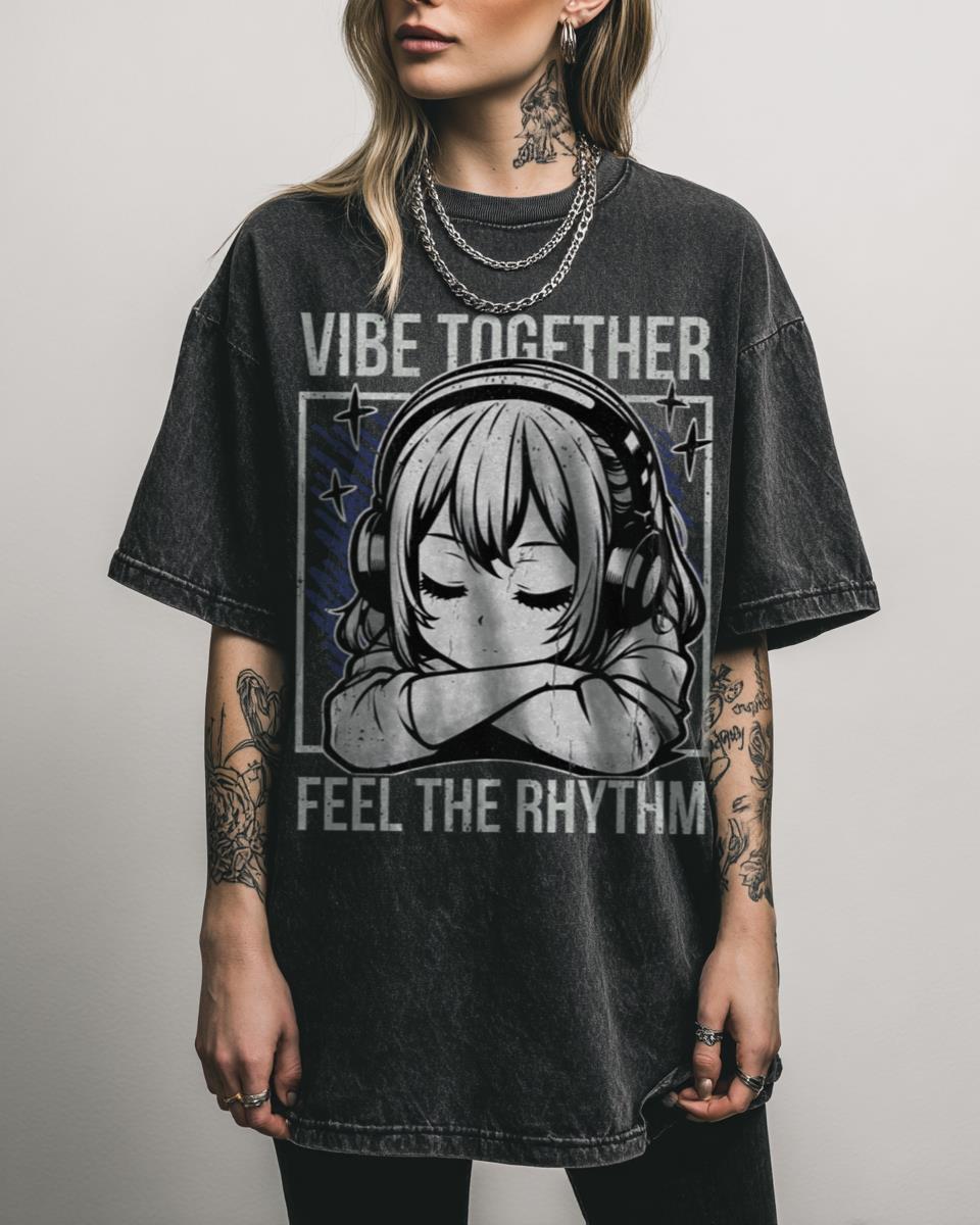 Do you seek peaceful, music-inspired designs that resonate with your soul? Experience ‘Celestial Harmony’ with our ‘VIBE TOGETHER FEEL THE RHYTHM’ design, featuring elegant white letters. This dreamy tee showcases a girl with closed eyes, headphones on, immersed in a sonic journey against a stars background. It’s a heartfelt tribute to music lovers, promoting relaxing…