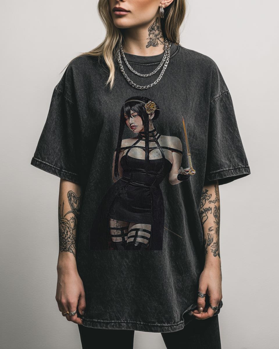 Why Choose This Yor Forger Drawing Cutout T-Shirt? Show your appreciation for the world of espionage with this Yor Forger Drawing Cutout T-shirt, inspired by the beloved Spy X Family anime. Featuring a unique graphic of the “Thorn Princess,” this black acidwash tee is a stylish addition for any fan of the series. Key Features…