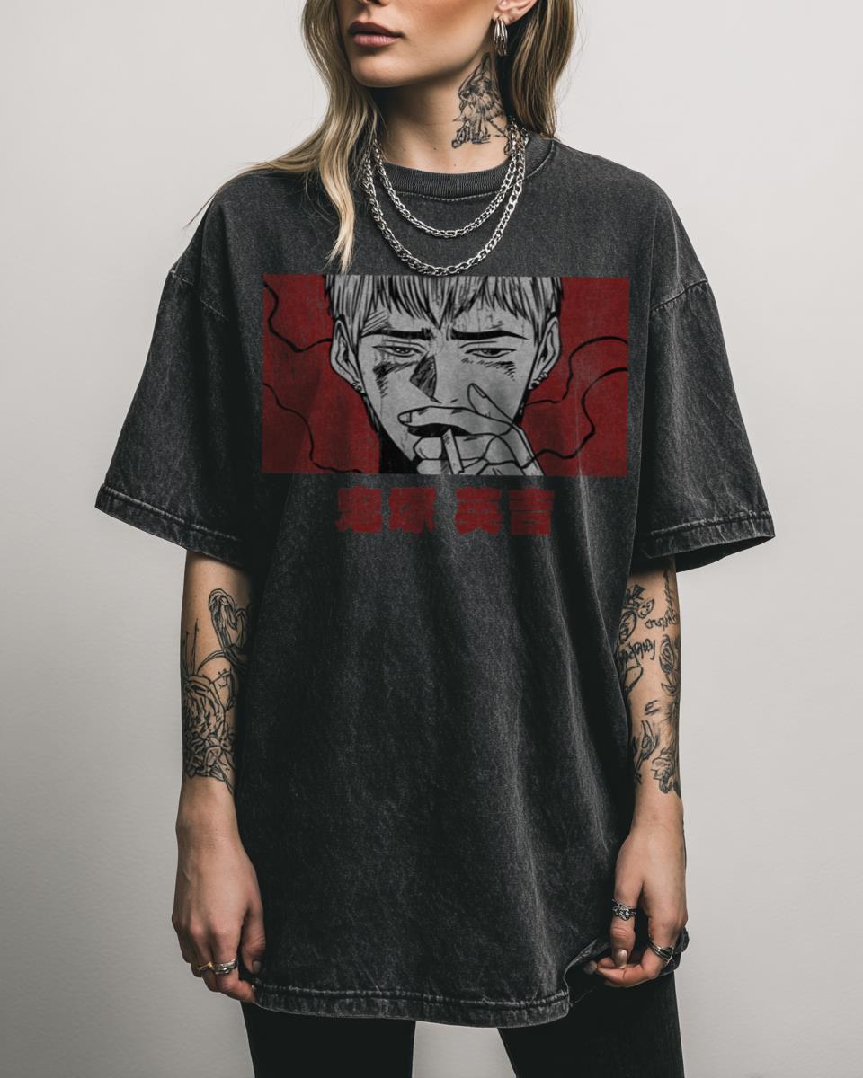 Do you remember the legendary and hilarious Great Teacher Onizuka? Channel the unforgettable presence of Eikichi Onizuka with this ‘GTO (鬼束)’ T-shirt! This design, featuring a bold and funny representation of Onizuka’s face or head in a classic 90s anime style, is a perfect tribute to the iconic Great Teacher Onizuka manga and anime series….