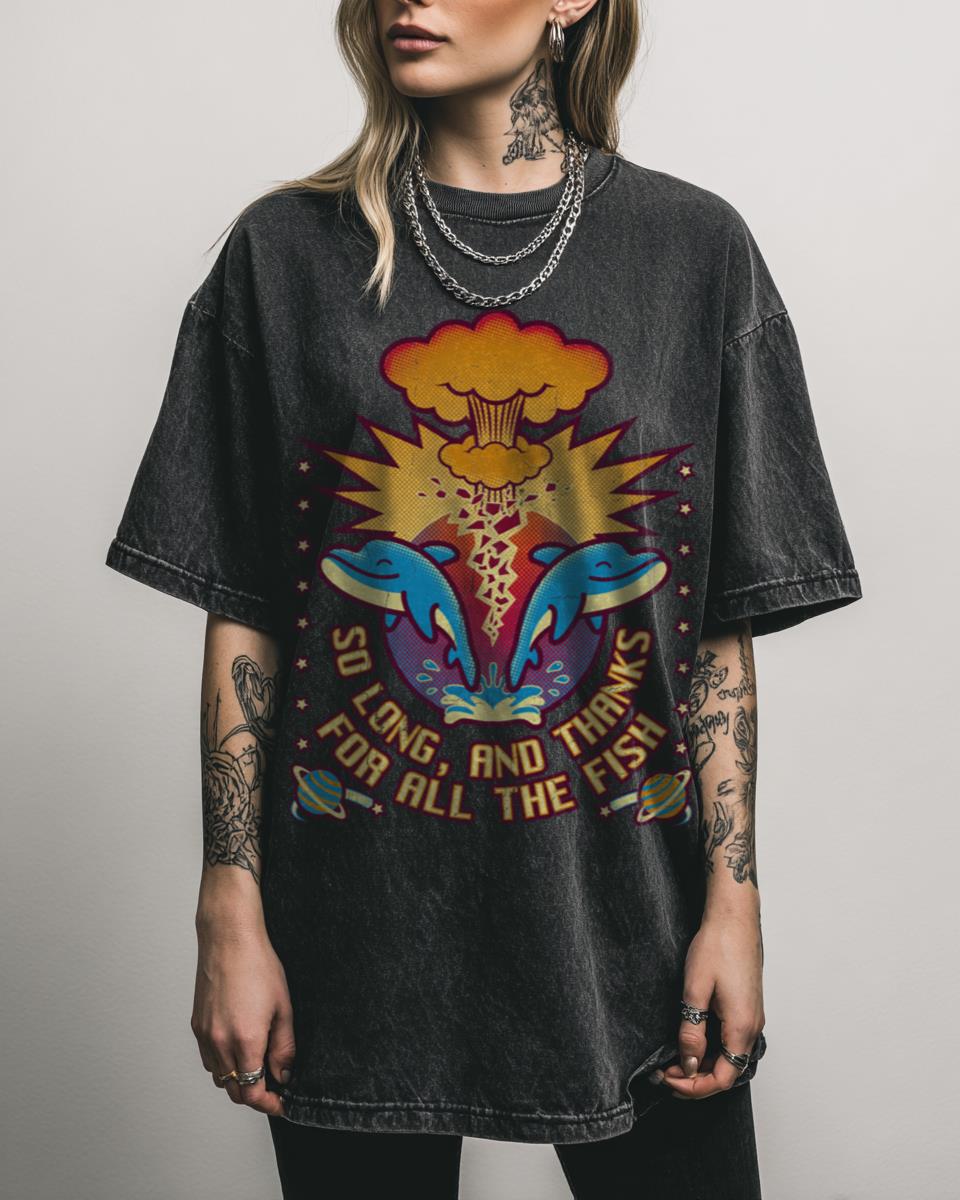 Are you ready to say a fond farewell to Earth with a legendary sci-fi quote? This ‘Thanks for all fish’ design (correcting the typo to ‘for all the fish’) is a classic reference from Douglas Adams’ ‘The Hitchhiker’s Guide to the Galaxy’, famously left by dolphins before Earth’s destruction. It’s a humorous and nostalgic piece…
