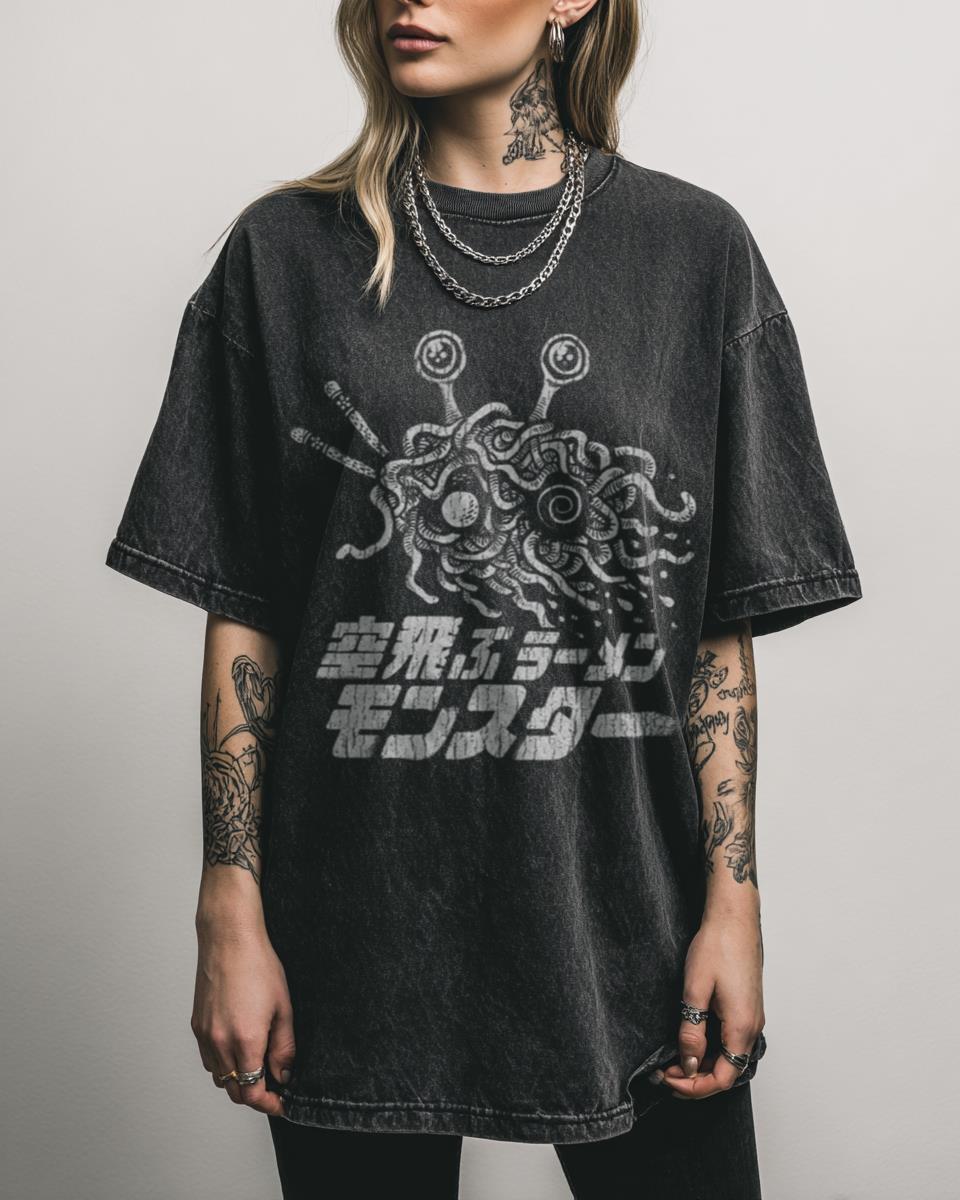 Praise His Noodly Appendages with The Flying Ramen Monster Tee? Embrace your inner Pastafarian with “The Flying Ramen Monster” T-Shirt. This humorous design, blending the iconic Flying Spaghetti Monster with a Japanese ramen twist, makes for a funny and unique black acidwash tee for anime fans and parody lovers alike. Why This Pastafarian Parody Tee…
