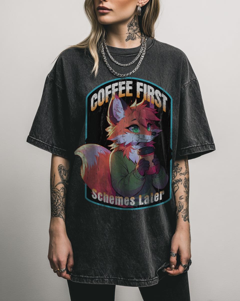 Are you a coffee enthusiast who loves a good plan… after your morning brew? This adorable t-shirt features a charming anime fox paired with the humorous quote ‘Coffee First Schemes Later’. It’s a delightful design for anyone who prioritizes their caffeine fix before embarking on their daily adventures or elaborate plans, blending cute anime aesthetics…