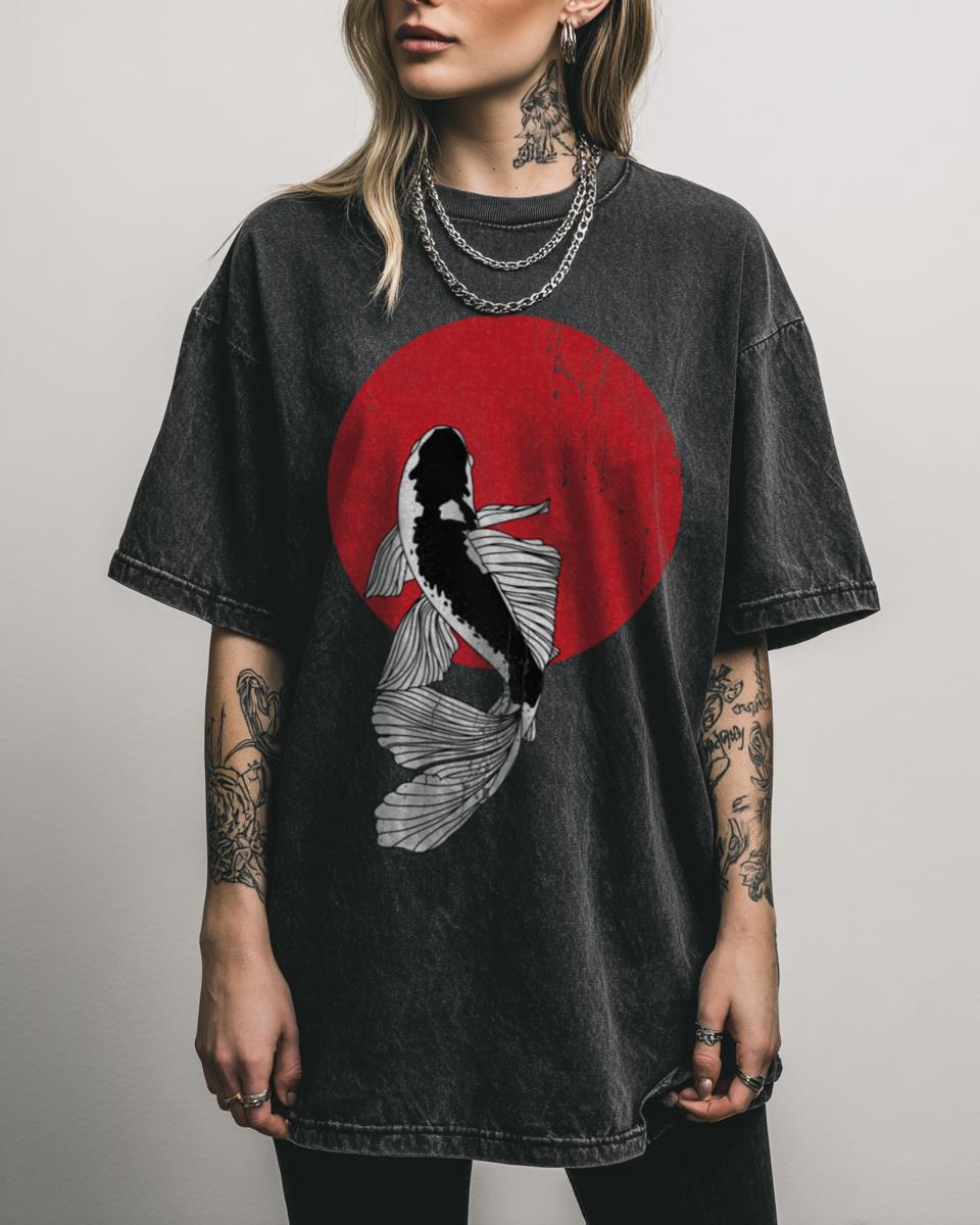 Seeking a blend of timeless tranquility and edgy expression? This stunning “Koi Fish & Red Moon Vector” design brings together oriental elegance with a modern, street-style zen. Featuring a distressed koi fish under a red moon, this graphic evokes lunar harmony and vintage Japanese vibes, perfect for those who appreciate unique aesthetics and cultural depth….