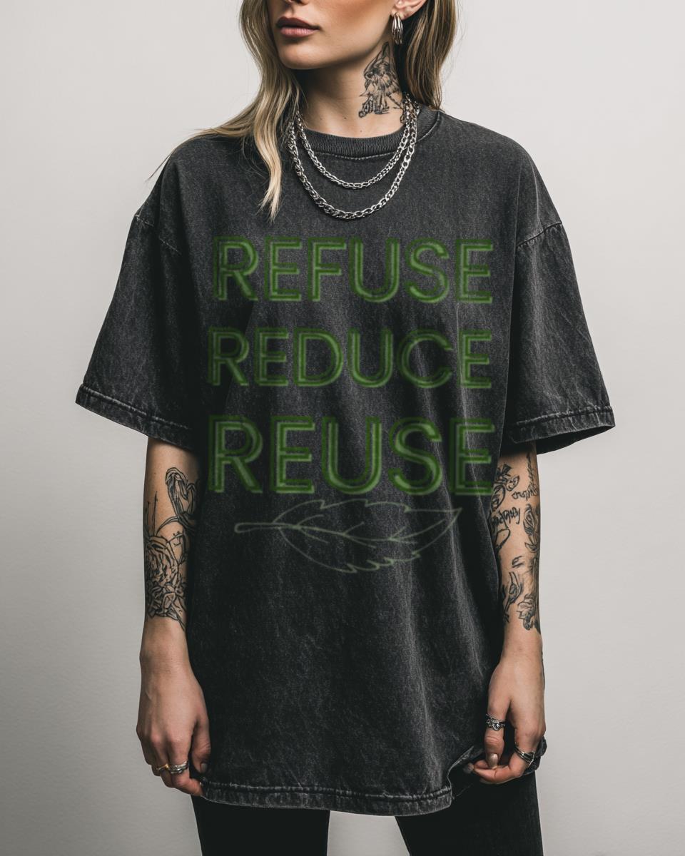 Why is the “Refuse, Reduce, Reuse” T-Shirt Key for Minimalist Sustainable Living? Champion a greener lifestyle with this **”Refuse, Reduce, Reuse” T-shirt**, a minimalist graphic design advocating for zero waste and sustainable living. Featuring a clean, impactful message on a distinctive black acidwash, this tee is perfect for eco-conscious individuals committed to protecting our planet…