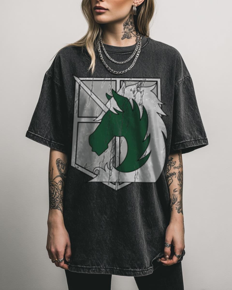Stand with the Military Police from Attack on Titan! This T-shirt features a design inspired by the Military Police Brigade from the epic anime and manga series, Attack on Titan. With a prominent green hue often associated with the corps, it’s a subtle yet powerful nod to one of the key factions in the fight…