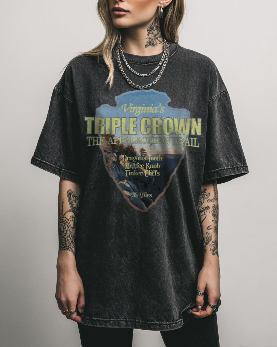 Planning your next big adventure on the Appalachian Trail? This unique graphic tee features a stylized arrowhead design representing Virginia’s iconic Triple Crown Loop. It’s a perfect tribute to the challenging and breathtaking journey through Dragons Tooth, McAfee Knob, and Tinkers Cliff, ideal for those who’ve conquered or aspire to conquer this legendary hiking route….