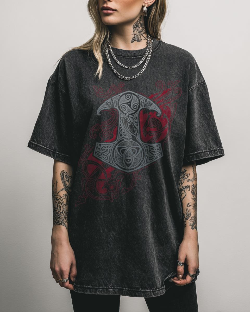 Embrace the power of Norse mythology and ancient Celtic artistry! This stunning graphic tee features ‘Raven’s Mjolnir’, a powerful design combining the iconic Mjolnir (Thor’s hammer) with intricate Celtic knotwork and majestic raven art. Adorned with elements of fire and flame, this design embodies the spirit of Viking warriors and Norse legends, perfect for those…
