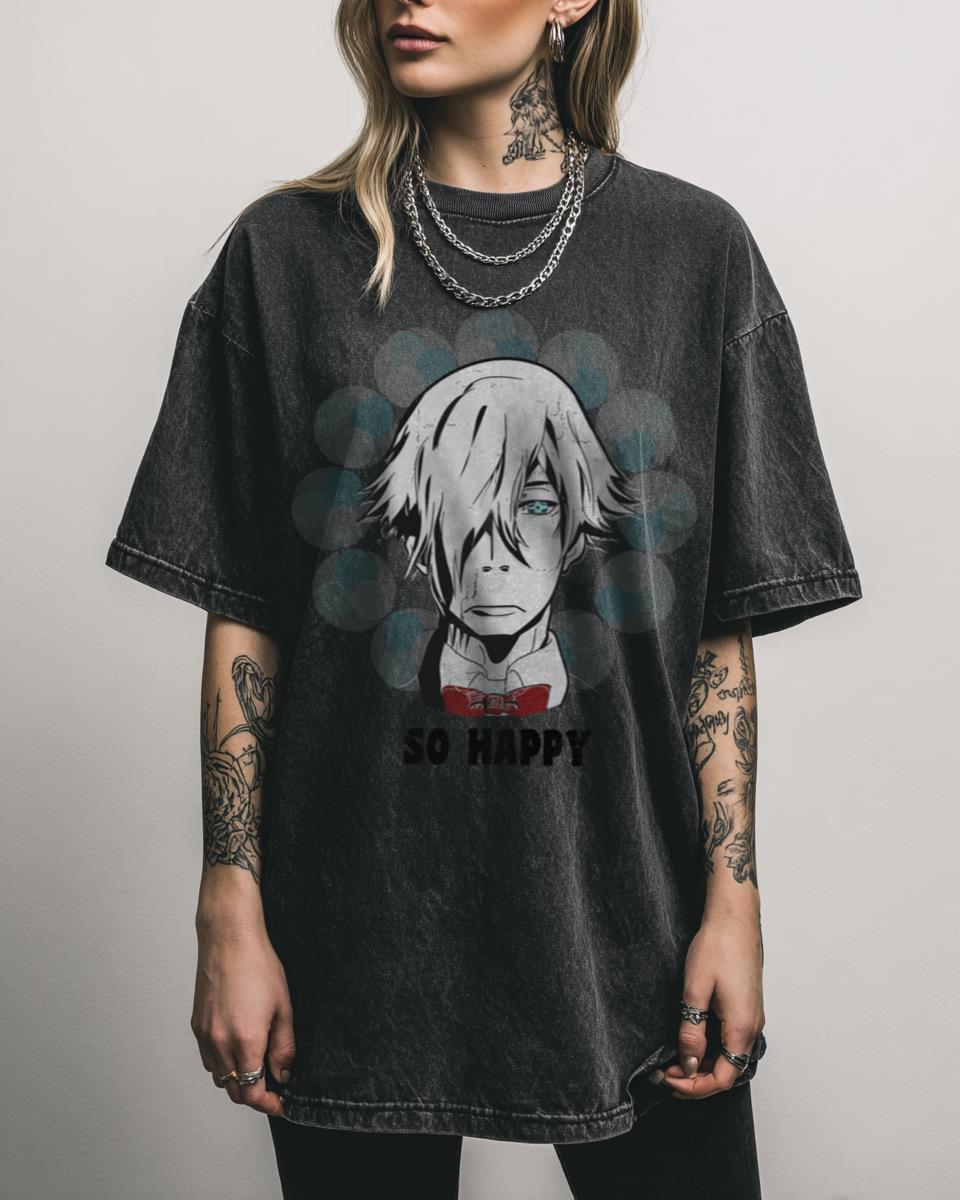 Even an arbiter of the afterlife can find a moment to be ‘So Happy’! Bring a touch of dark humor to your wardrobe with this ‘DEATH PARADE – SO HAPPY’ t-shirt. This artistic design playfully juxtaposes the solemn Decim from the Death Parade anime with an unexpectedly cheerful phrase, creating a funny and unique parody….
