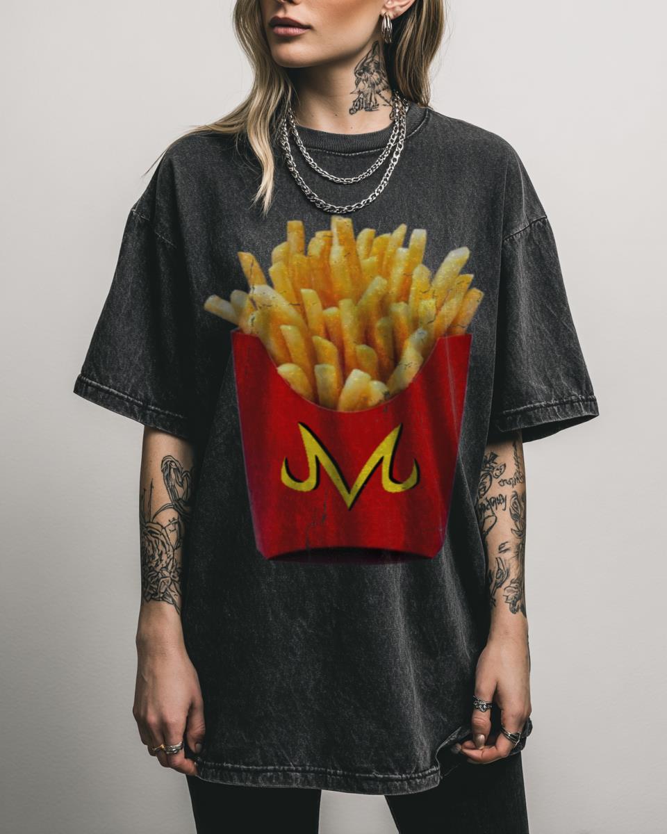 What happens when a Saiyan gets a craving for fast food? Indulge in this hilarious “Majin Fries” design, a clever parody blending the iconic Majin symbol from Dragon Ball Z with everyone’s favorite fast-food fries. It’s a funny and unique tee for anime fans with a sense of humor and a love for snacks! Why…