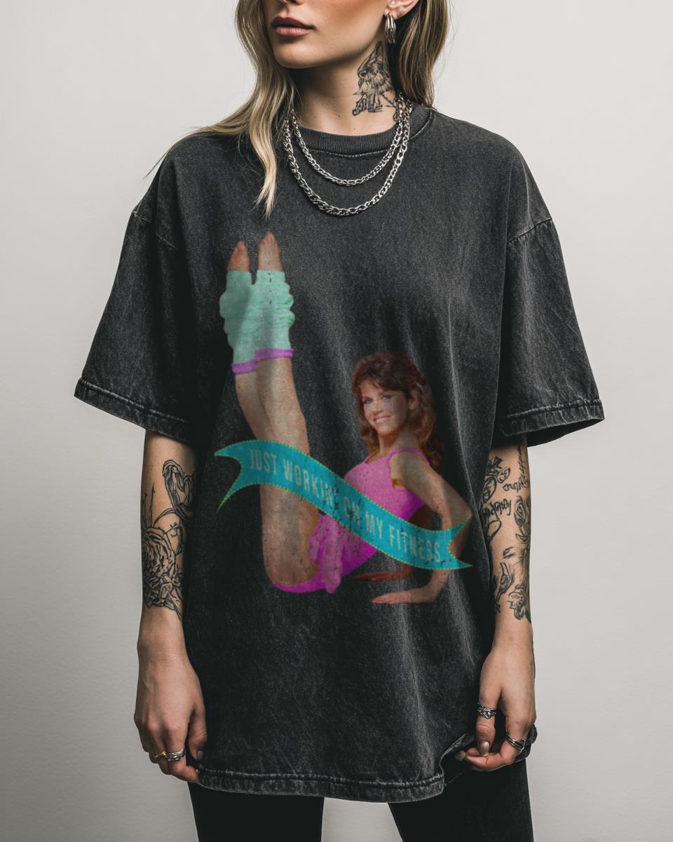Ready to Rock This Jane Fonda 80s Fitness T-Shirt? Get ready to sweat (or just look like you did!) with this “Just workin’ on my fitness Jane Fonda” graphic tee. Celebrating the iconic 80s aerobics era and featuring a fun quote, this black acidwash shirt is a perfect blend of retro style and fitness nostalgia….