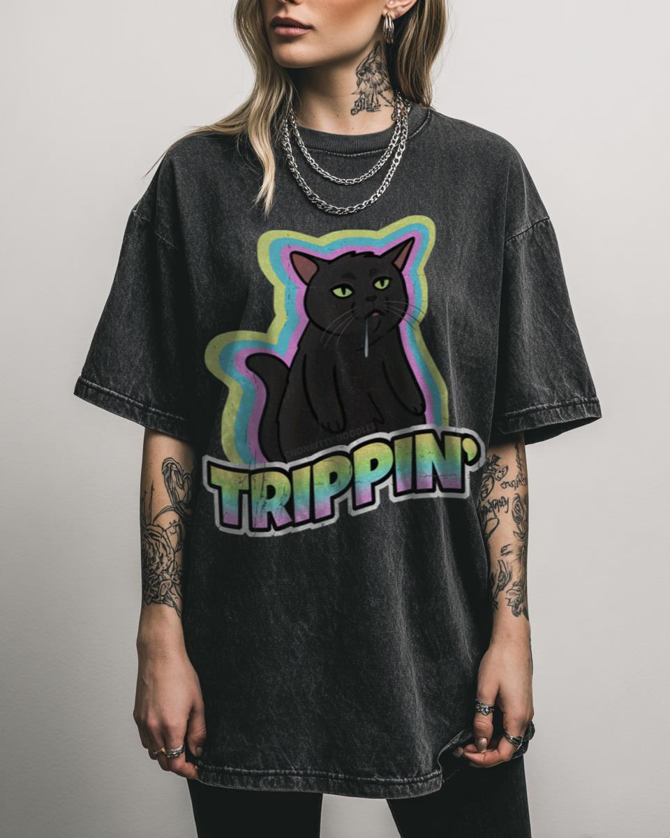 Ready to embrace some whimsical, psychedelic humor? Get lost in the cosmic vibes with this “Trippin – Funny Black Cat Zoning Out Meme” design! This graphic features a chonky, furry black cat in a trippy, psychedelic art style, perfectly capturing that “tripping balls” sensation. It’s a vibrant and whimsical piece that blends retro 70s aesthetics…
