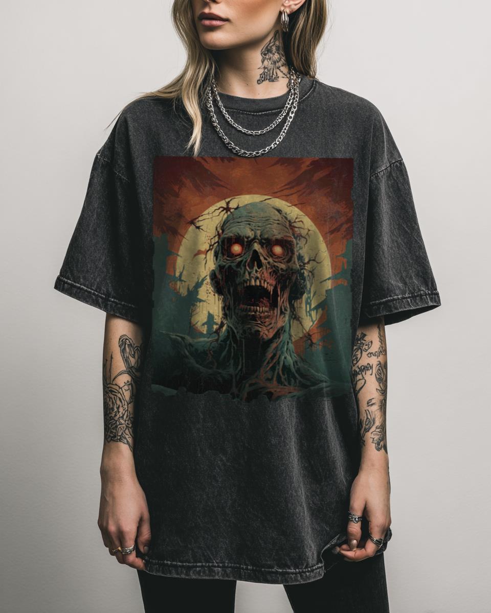 Dare to wear a chilling blast from the past? Step into a scene straight out of an 80s horror flick with this ‘Zombie Emerging from the Haunted Woods’ graphic tee. Designed in a retro movie poster style, this chilling artwork captures the frightening essence of a zombified ghoul, perfect for fans of vintage horror films…