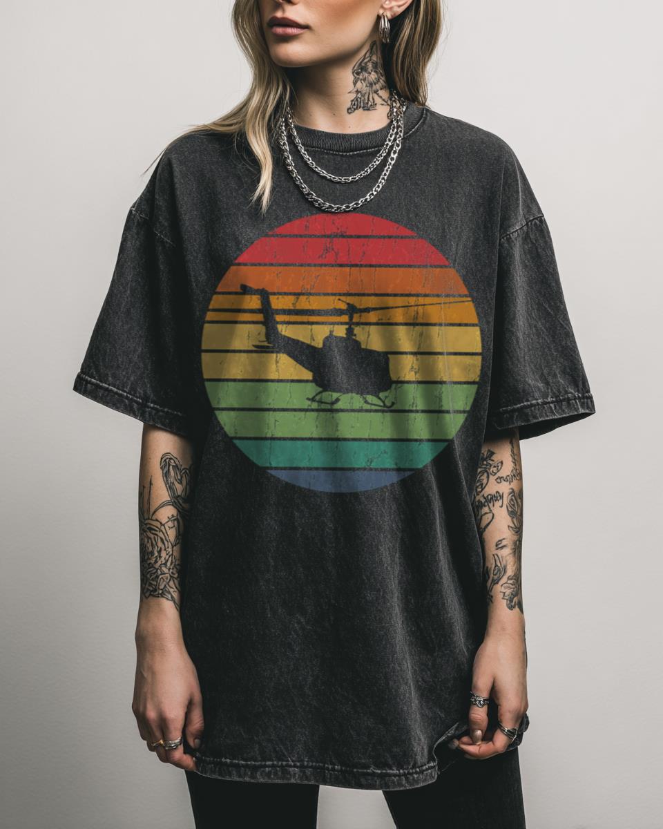 Take flight back in time with this cool vintage military helicopter design! This retro-inspired design features a classic military helicopter, evoking the aesthetics of the 70s and 80s. Perfect for aviation enthusiasts, veterans, or anyone who appreciates the timeless appeal of vintage aircraft and military history, adding a touch of classic cool to your style….