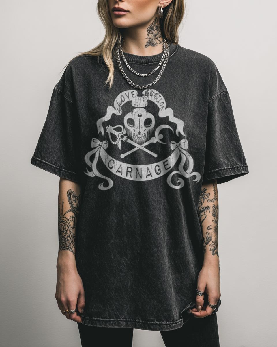 Ready to unleash a blend of cute and chaotic? Embrace the unexpected with this ‘Love, Justice, CARNAGE’ design! Merging the sweet innocence of magical girls like Sailor Moon with a bold, punk rock edge and a hint of dark humor, this tee is perfect for those who love their anime with a side of rebellion….