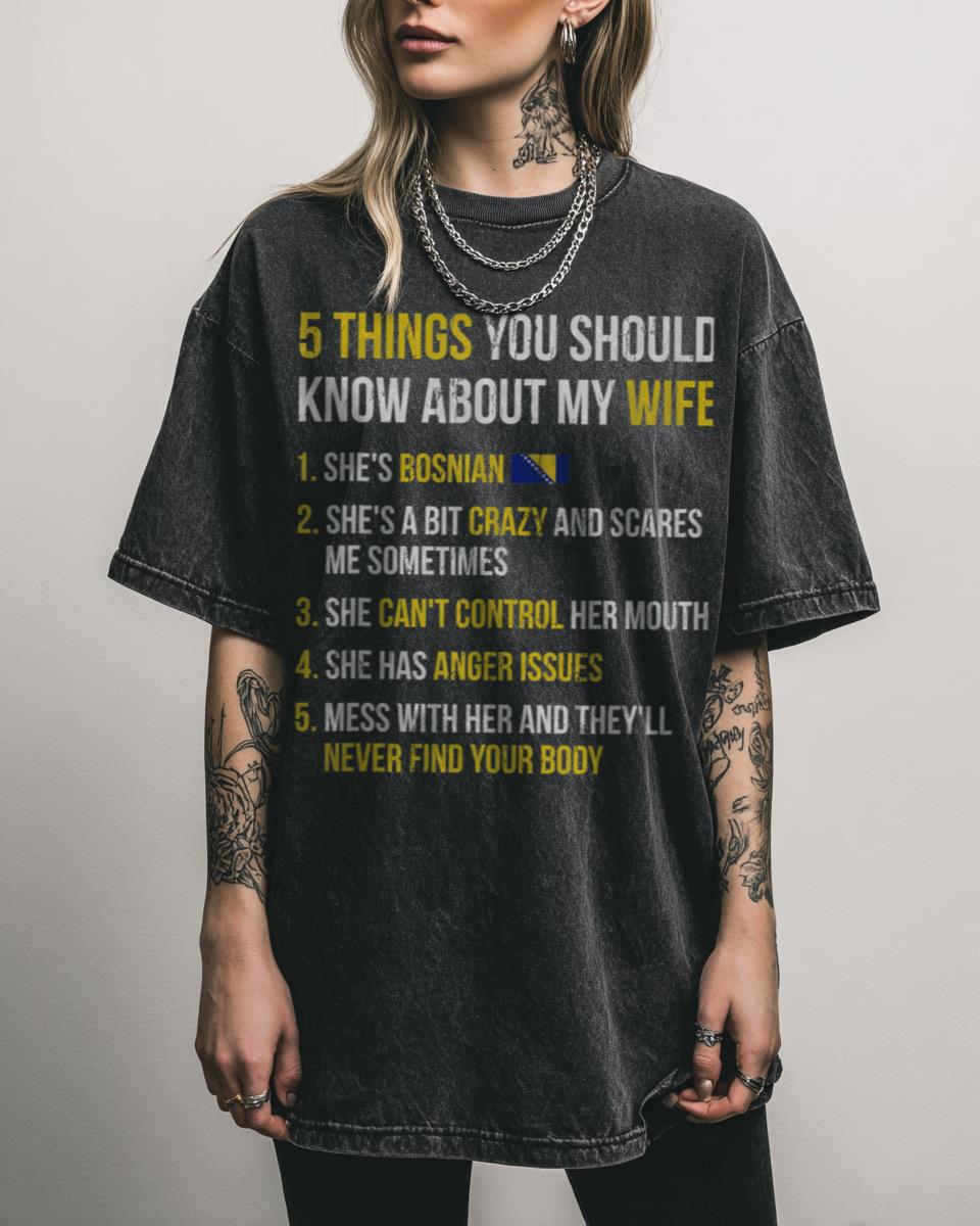 Do you have a wonderful Bosnian wife and a great sense of humor? Celebrate your unique relationship with this hilariously honest ‘5 Things You Should Know About My Bosnian Wife’ t-shirt. It’s a playful and affectionate way to share a glimpse into your life with your spouse, perfect for husbands who love to show off…