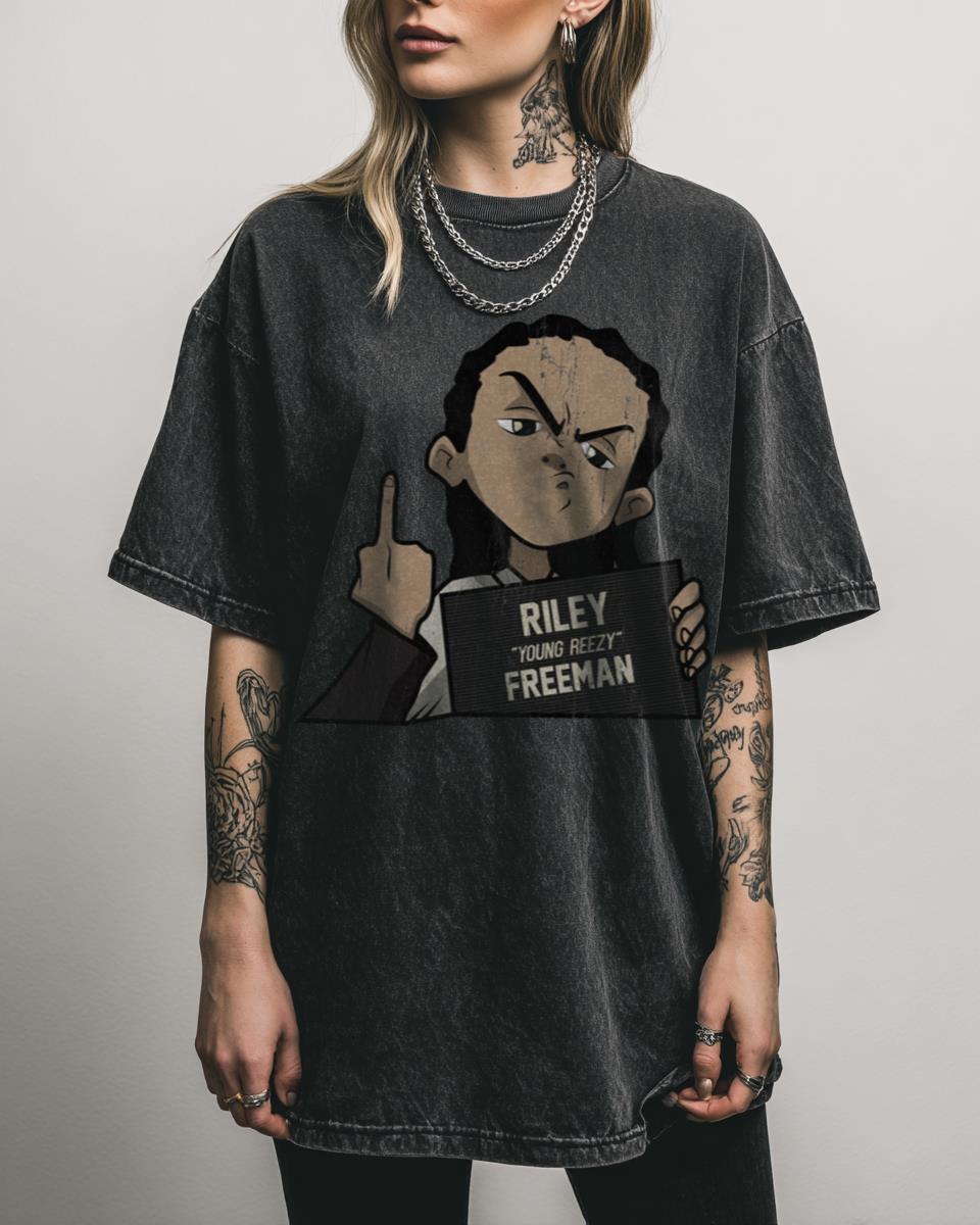 Are you a fan of the iconic and often mischievous Riley Freeman? Represent the youngest and most street-smart Freeman brother with this awesome Riley Freeman “Young Reezy” tee from The Boondocks. Capturing the essence of the beloved animated sitcom, this design is a must-have for fans of sharp satire, black comedy, and unforgettable cartoon characters….