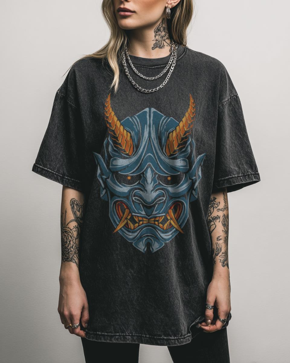 Embrace the fierce power and ancient mystique of Japanese folklore! Unleash your inner warrior with this striking ‘Oni Mask’ T-shirt, featuring a captivating design inspired by traditional Japanese demon masks. This art piece, reminiscent of Hannya and Samurai tattoos, embodies the strength, protection, and enigmatic allure of Japanese culture. It’s a perfect blend of anime…