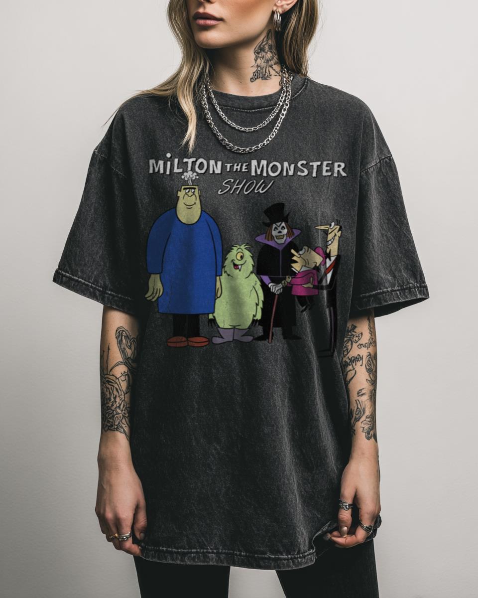 Looking for a blast from the past with classic cartoons? Rediscover the charm of vintage animation with this awesome graphic tee featuring characters and the logotype from the iconic 60s Milton the Monster Show. This design is a nostalgic treat for fans of retro Hanna-Barbera style cartoons and classic monster fun, perfect for bringing back…