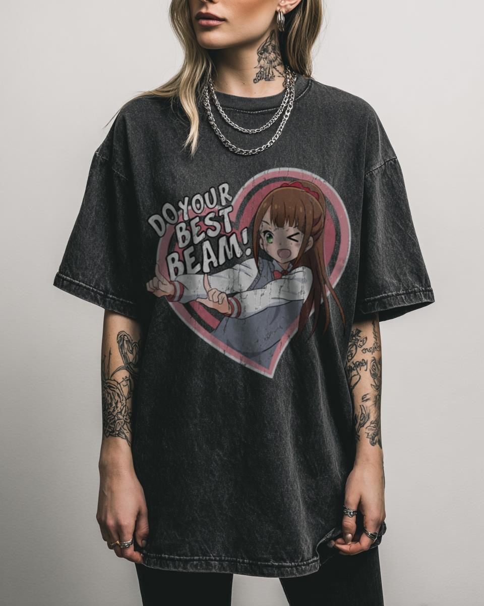 Why Is This “Do Your Best Beam!” Anime Tee a Fan Favorite? Spread positivity with this “Do Your Best Beam!” anime T-shirt, inspired by the endearing character Hitori Bocchi. Featuring the iconic phrase, this black acidwash graphic tee is a charming piece of fan art, perfect for enthusiasts of Hitoribocchi no Marumaru Seikatsu and cute…