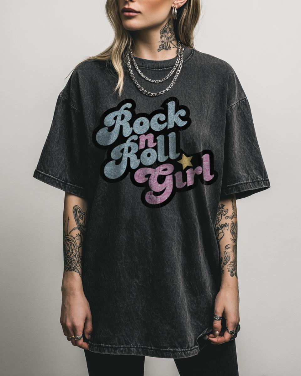 Ready to groove to the rhythm of the past with a touch of rock n’ roll? Step back in time with this ‘Rock n’ Roll Girl’ vintage-inspired design, perfectly blending the vibrant energy of 70s disco with classic 80s flair. Featuring a stylish girl amidst glittery music motifs, it’s an homage to the golden eras…