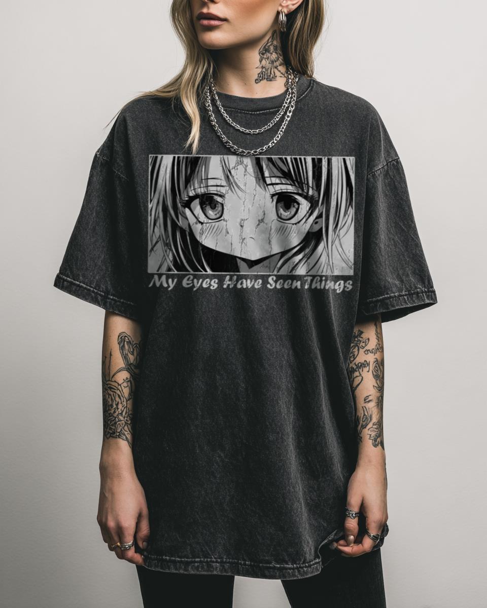 Have your eyes witnessed tales worth telling, with a touch of humor? Share your experienced gaze with our “Witty Anime Girl Eyes” T-shirt! This intriguing black and white design features a close-up of expressive anime girl eyes, accompanied by the humorous and knowing phrase “My Eyes Have Seen Things.” It’s a hand-drawn, emotional piece that…