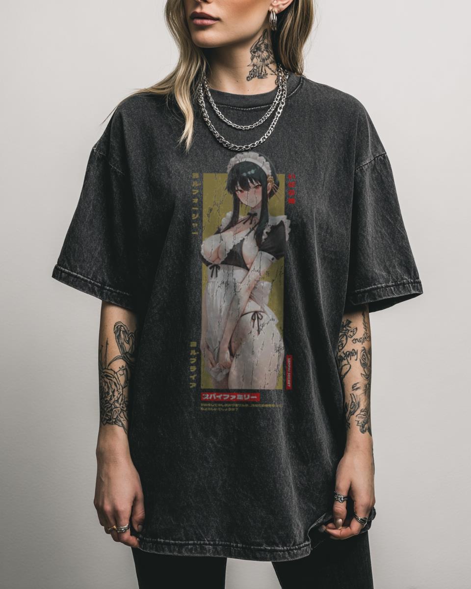 Are you a daring fan of Spy x Family and the enigmatic Yor Forger, with a playful twist? Discover the captivating charm of the Thorn Princess in a maid outfit with this ‘Yor Forger Maid Lewd Waifu’ graphic tee. This design features a unique portrayal of Yor Briar, blending the popular waifu aesthetic with a…