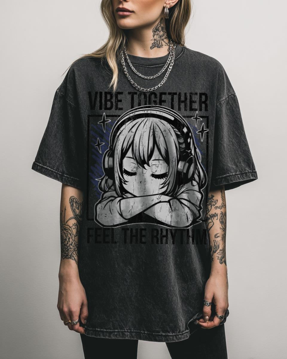 Do you get lost in music and seek designs that resonate with your peaceful vibe? Immerse yourself in ‘Celestial Harmony’ with our ‘VIBE TOGETHER FEEL THE RHYTHM’ design. This dreamy tee features a girl with closed eyes, headphones on, lost in a sonic journey against a stars background. It’s a tribute to music lovers, relaxing…