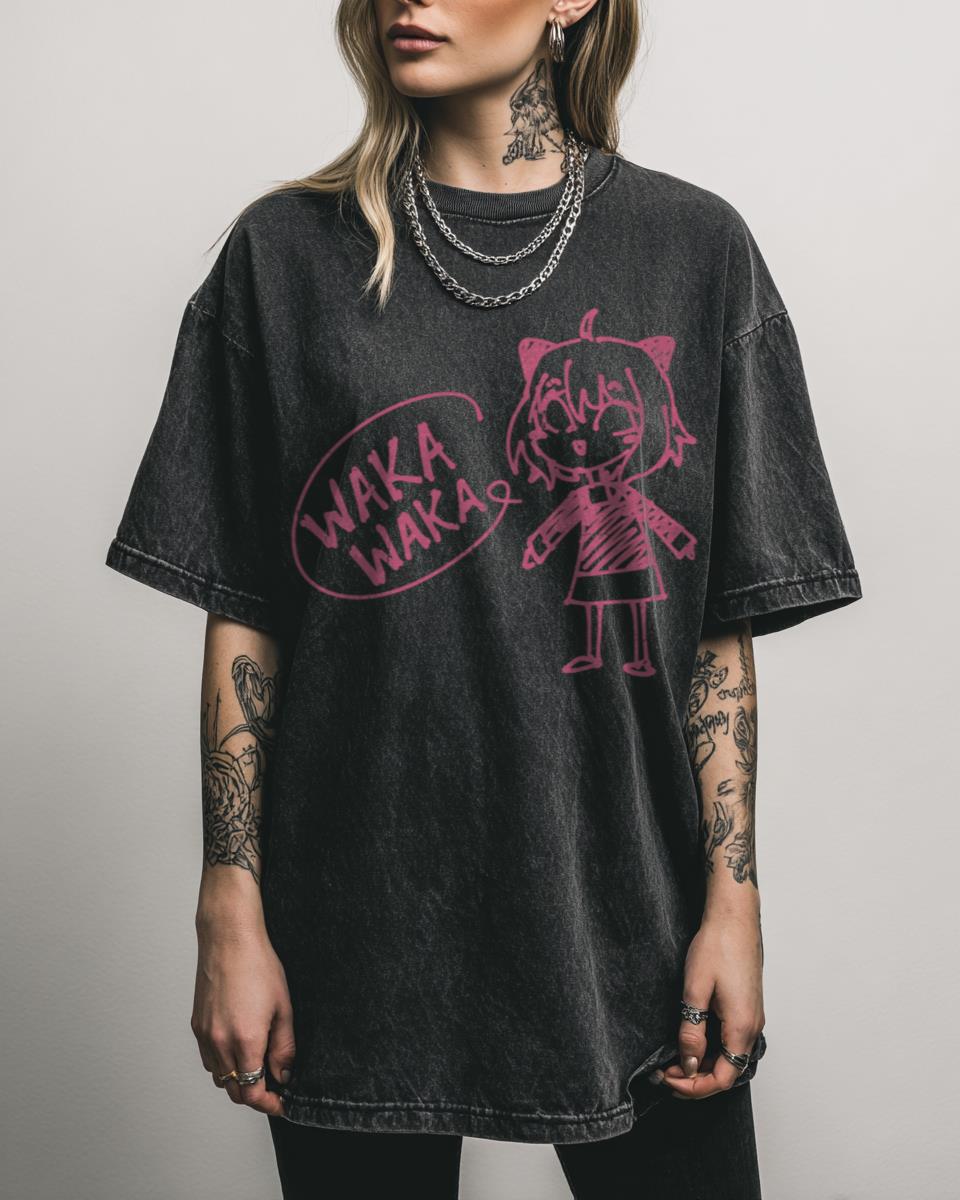 Who can resist Anya Forger’s adorable expressions and catchphrases? Embrace the cuteness of Anya Forger with this ‘Waka Waka’ T-Shirt, inspired by her iconic moments in ‘Spy x Family.’ This charming anime design captures Anya’s playful spirit, making it a perfect gift for fans of the manga and anime who adore her unique personality. Waku…