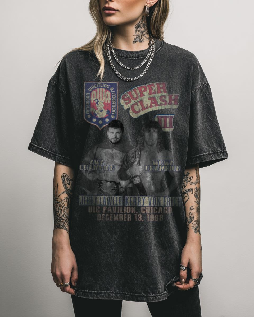 Relive the glory days of classic 80s professional wrestling! Step into the squared circle with this ‘AWA Superclash 3’ graphic tee, a tribute to one of the most iconic events in retro pro wrestling history. Featuring a vintage design that captures the excitement of the 80s wrestling era, this shirt is perfect for fans who…