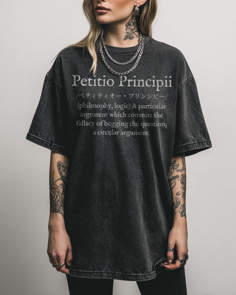 Ready to wear your intellect on your sleeve, literally? Dive into the world of logic and philosophy with our ‘Petitio Principii’ design. This shirt cleverly presents the logical fallacy known as ‘begging the question,’ complete with English, Katakana transliteration, and pronunciation. It’s the perfect blend of academic insight and unique style. Smart Style for the…