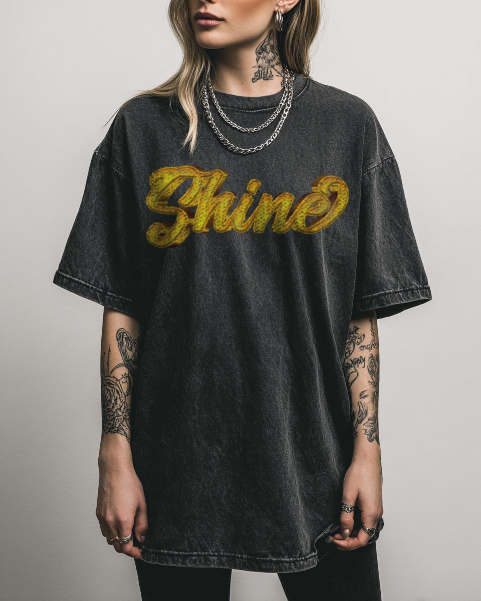 What Makes This ‘Shine’ Gold Script T-Shirt Stand Out? Embrace a touch of glamour with this ‘Shine’ gold script typography T-shirt. Featuring a glossy, modern design on a unique black acidwash tee, this shirt combines sophisticated style with everyday comfort for a truly fashionable statement. Key Features of Your New Favorite Graphic Tee: Stylish Gold…