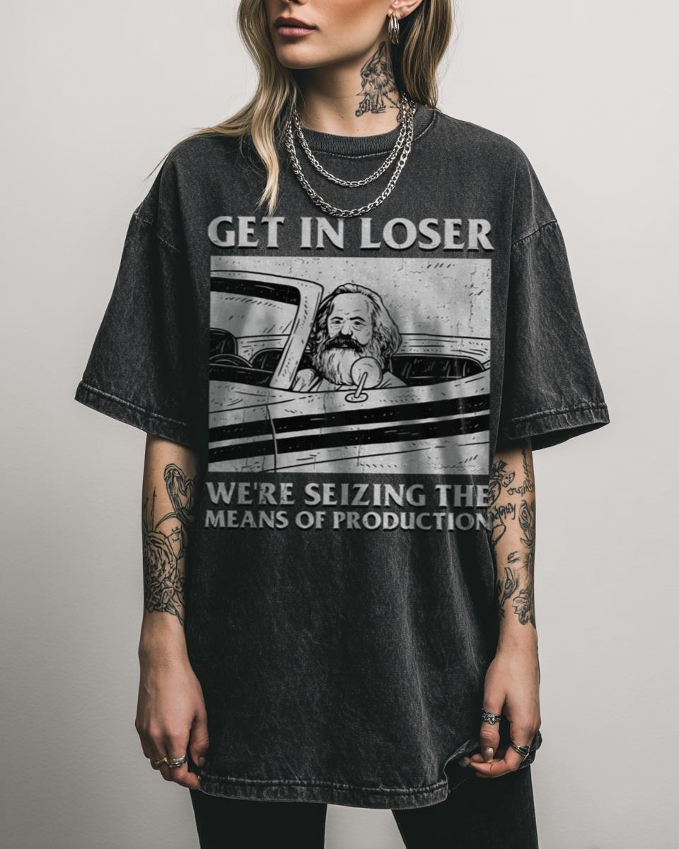 Ready to make a bold statement with a touch of anime and revolutionary humor? Drive change with this “Get In Loser We’re Seizing The Means Of Production” T-Shirt! This clever and humorous design combines a popular internet meme with a revolutionary twist, often associated with various anime fandoms. It’s perfect for those who appreciate witty…