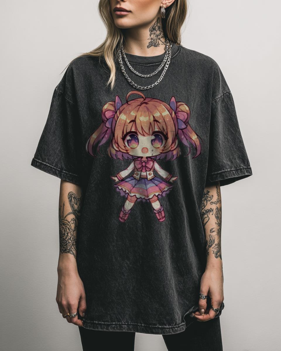 Looking for a blend of cute and edgy in your anime fashion? Embrace your dark yet adorable side with this ‘Snap Back’ acidwash T-shirt, featuring a charming demon girl with horns. This design blends kawaii aesthetics with goth, grunge, and punk elements, perfect for fans of pastel goth and alternative anime. It’s a unique and…