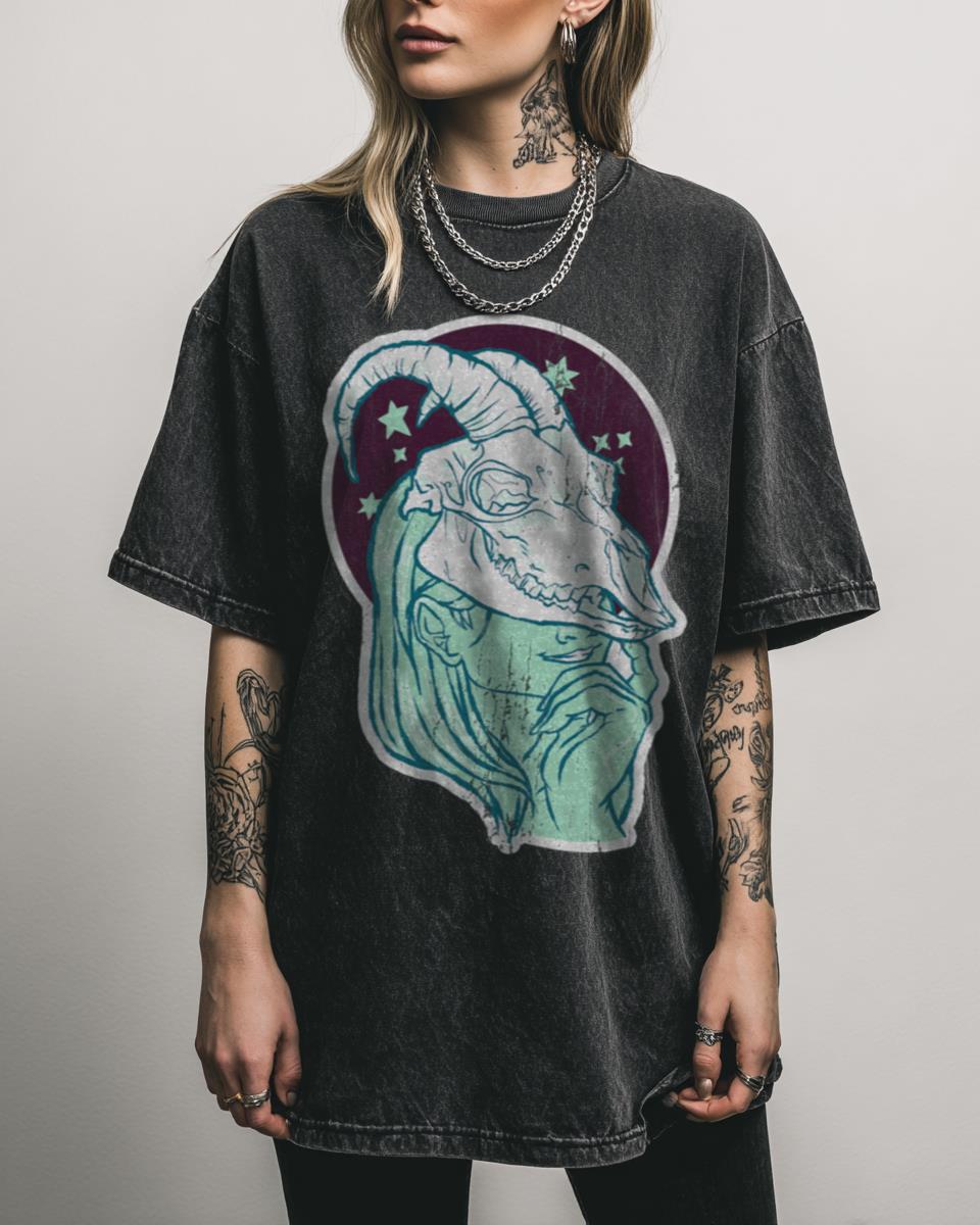 Dare to wear something beautifully bizarre? Unleash your esoteric side with ‘The Billygoat’ T-shirt, a captivating blend of creepy, pastel goth, and galaxy aesthetics. This unique design features a skull-faced billygoat surrounded by stars, embodying themes of death, the zodiac, and the weird wild. Perfect for those who love dark, mystical art. Why This Pastel…